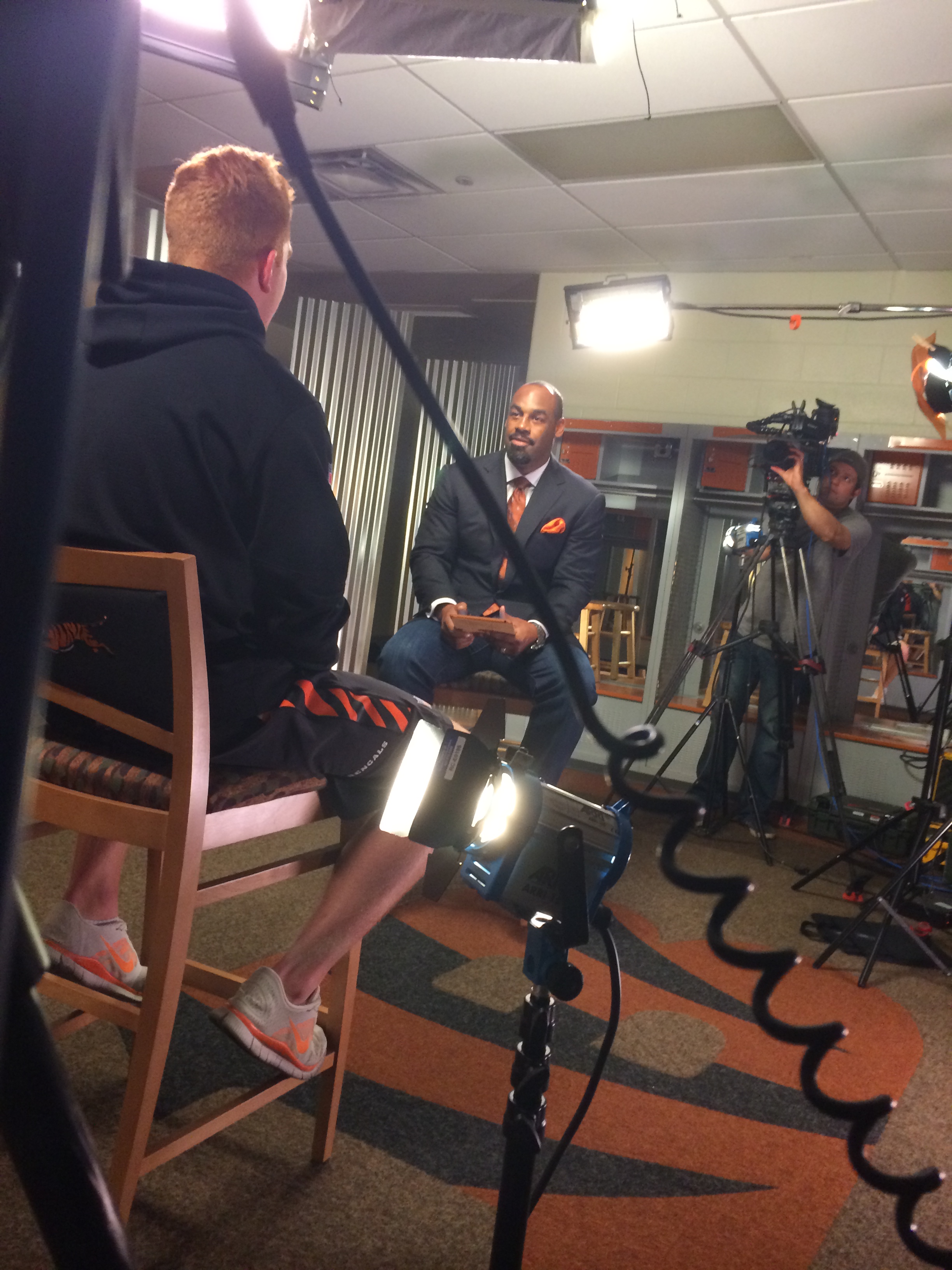 Our setup in one of the Bengals locker rooms was pretty elaborate and included bringing in some aluminum siding to create a nice reflective background that could be positioned and lit however we chose. Once again we were using the MYT slider for the third camera on the wide shot and chose to hang some lights from the ceiling in order to keep them clear of the wide shot. Donovan McKnabb sat down with Andy Dalton for about 15-20 minutes and then we shot some hero shots with Andy before he headed to practice. Craig and I stayed behind to shoot B-Roll of Andy and A.J. Green warming up at practice. We then shipped the footage off to Los Angeles where it was edited and ready for TV the next night!