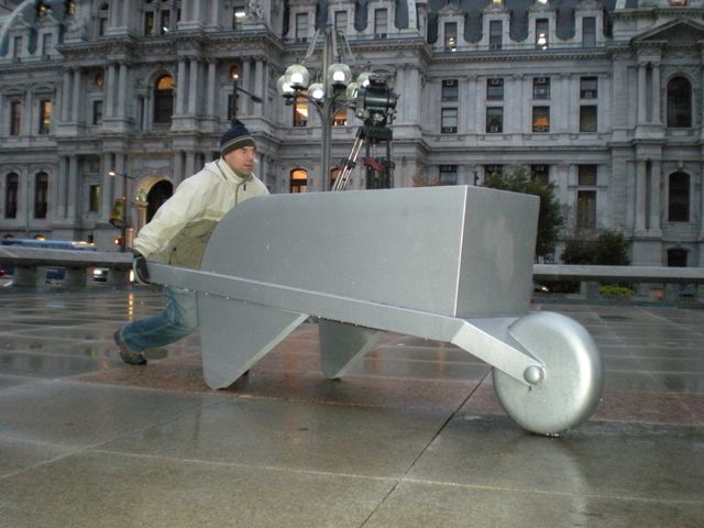 So, for the first time in World Series history, Game 5 was suspended for rain. Phillies fans are upset, Rays fans are hopeful. But Go To Team’s Charlotte-base crew, Skip Clark and Rene Cusson, are happy just playing around! Fox Sports brought the Varicam crew along to work as their ENG crew for the 2008 World Series and since there was no game on Tuesday, there wasn’t much for them to do. They drove to Wilmington, DE, where the Rays have moved to their new hotel to shoot some exteriors. Following that, they headed back to Philly to shoot video of the inclement weather that was keeping Game 5 on hold. Not really that hard of an assingment. So, naturally, they started goofing off. And what better place than the “Your Move” sculpture located in the Philadelphia Municipal Services Building plaza. There are game pieces from Monopoly, Sorry, Bingo, Dominoes, and even Chess. If you’re ever in Philly, this really is a cool place to stop by for some fun pictures! But future apprentices should take note, you’ll still have to push all of the gear around!