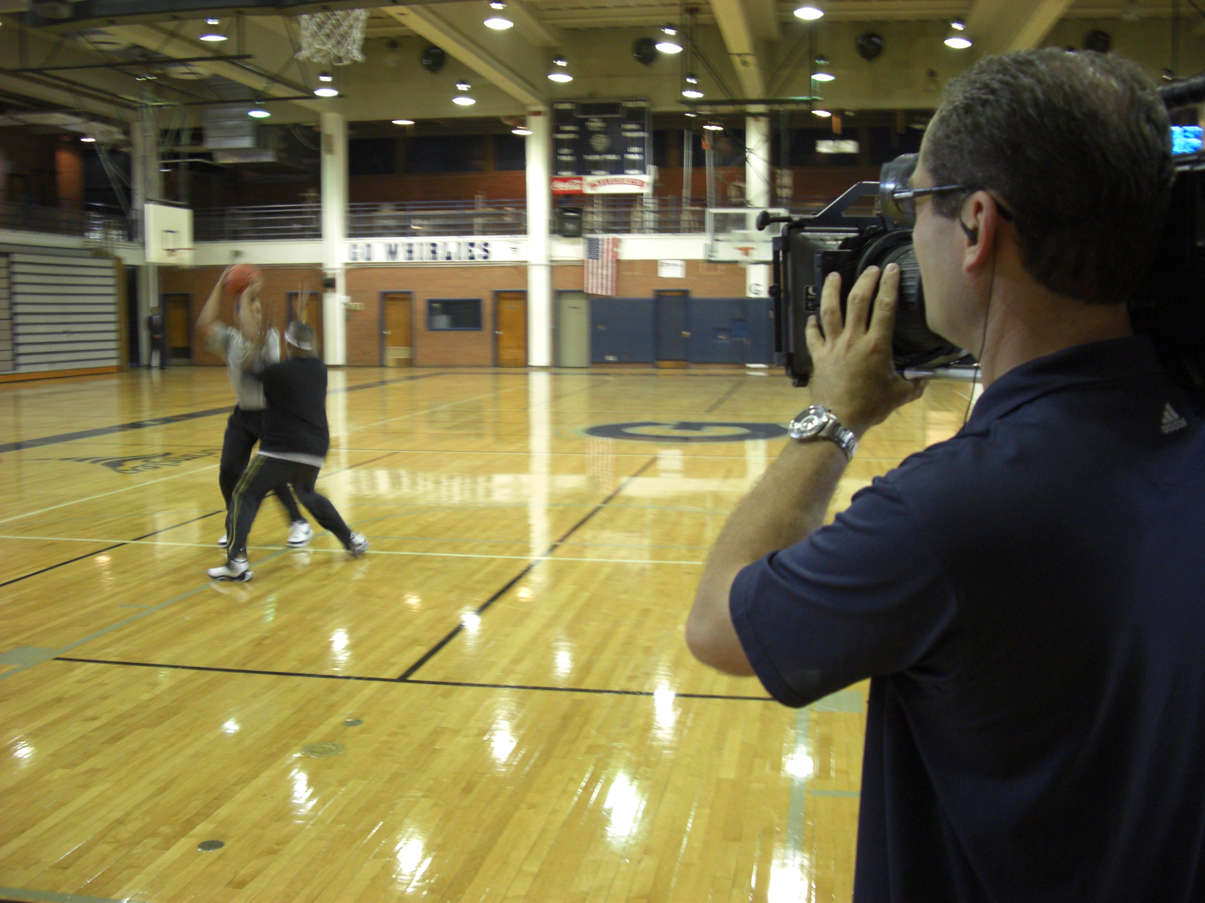 Alright, so we didn’t really get to play ball with the Democratic nominee. But we did shoot all the video! ESPN’s Stuart Scott and producer Marc Weiner came to Greensboro, NC, to interview the Presidential Candidate and Go To Team crewed the whole thing. Skip Clark from Charlotte, NC, and Jimmy Hall from Raleigh, NC, brought their Panasonic Varicams while Rene Cusson and Ian McCullen ran audio. Emily South was there from Charlotte as the make-up artist. ESPN had a one-on-one with the candidate as they used a high school gymnasium to set up the interview and then play a little basketball.