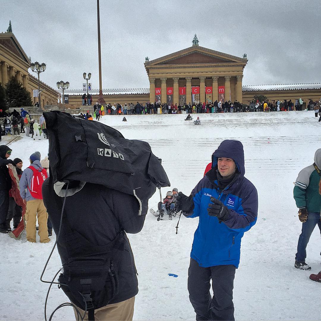 Fast forward six months to January and I’m in downtown Philadelphia, in the middle of Winter Storm Jonas, running audio for GTT’s DC cameraman, Ryan Ricker, who’s shooting live hits for The Weather Channel. This weekend is a top one for me, especially working with a LiveU made it possible for us to navigate the city freely and be able to get to places a satellite truck couldn’t go. For me, this was an awesome introduction as a Go To Team apprentice.