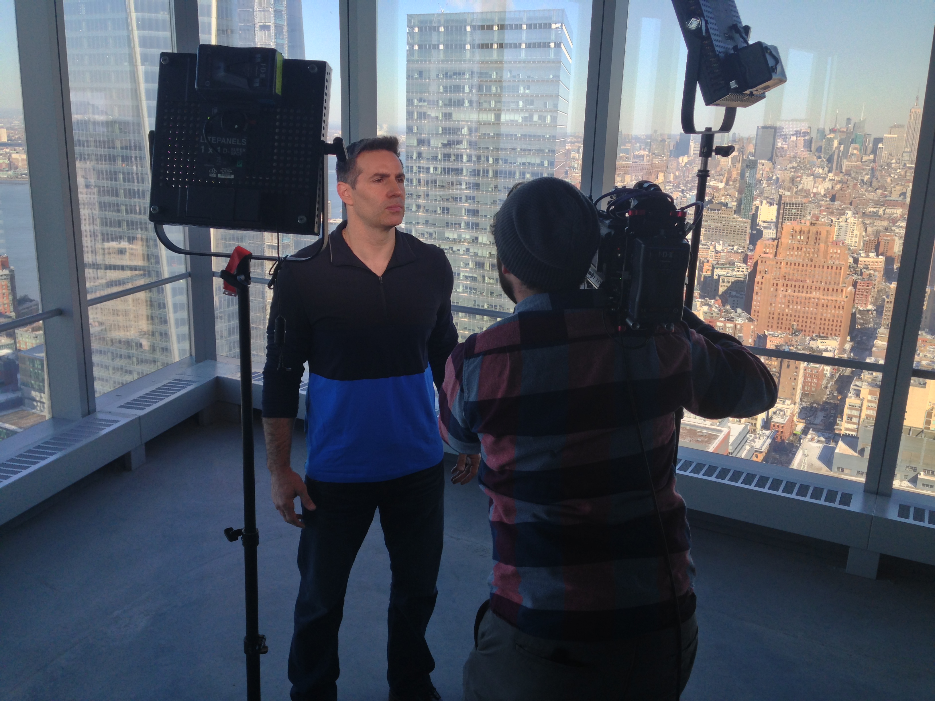 The week started with media day. We did sit down interviews on the F3 with Arri Ultra Primes with Kurt Warner and Peyton Manning and another with Deion Sanders and Richard Sherman. The space was tight, but the Ultra Prime we able to get that shallow depth of field to really make the interviews pop. Next we did shoots with Kurt Warner on the 50th floor of The World Trade Center and in the heart of Time Square with Willie McGuinst.