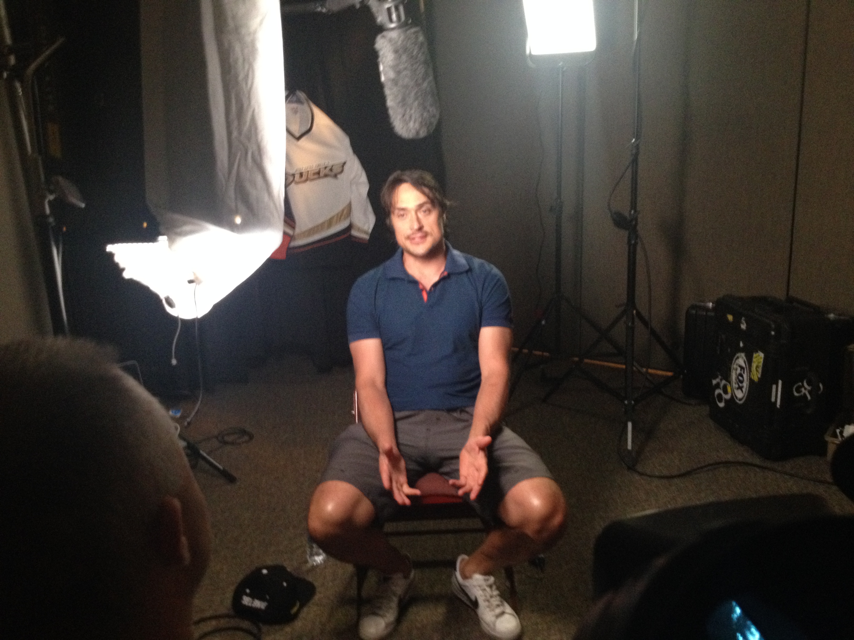 We arrived at the Honda Center nice and early to start setting up. We used a simple black curtain with some jerseys hanging up as our background. We interviewed several of the Ducks key players including 22-year veteran Teemu Selanne! We shot on the HDX-900 at 24p to get a real nice film look, and we used Nano Flash to be able deliver digital files for a quick turn around. I wanted a more dramatic look to these interviews since we were talking playoffs, rivalries, and the Stanley Cup. I simply used a Diva 400 as a key light and a somewhat harsh back light with no fill for the side of his face. This created some darker shadows on the subject’s face.